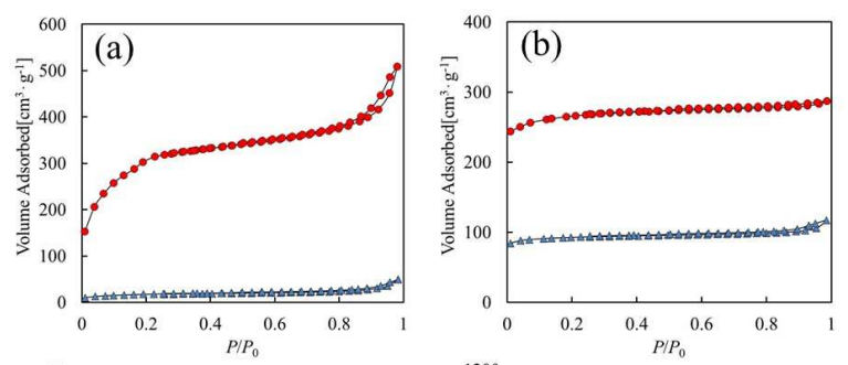 Figure 2. N2 adsorption/desorption isotherms for (a) MIL-53(Fe), (b) Cu3(BTC)2 prepared by scCO2 drying (red circle) and conventional drying (blue triangle).