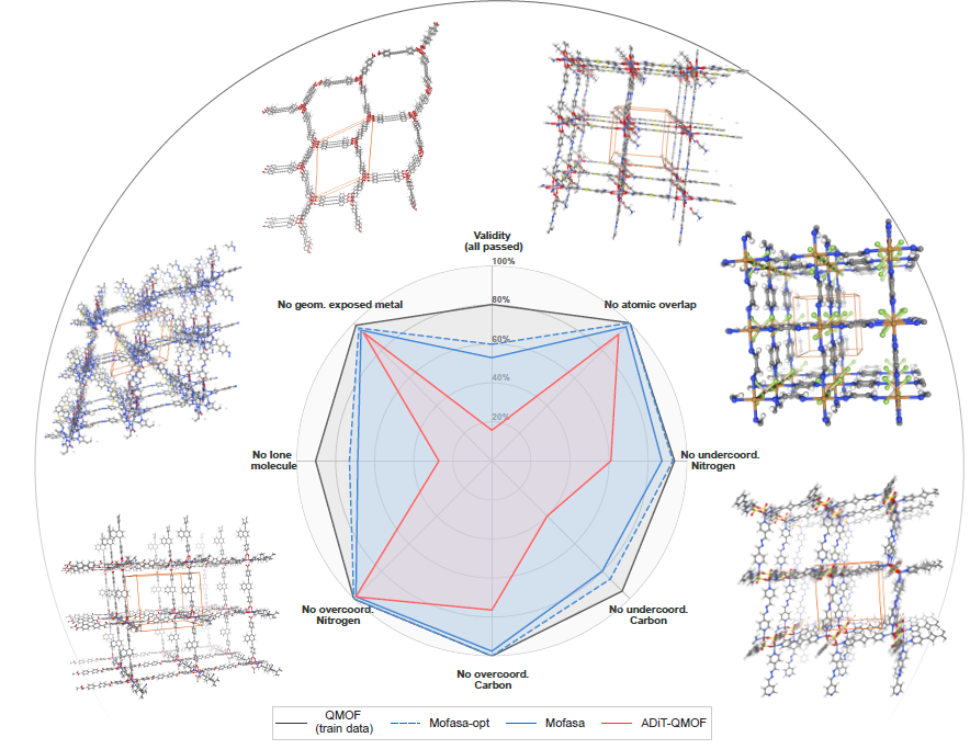 Figure 5 . Geometric validation with MOFChecker. Mofasa achieves a 3.8× leap in reliability compared to prior baselines, marking a decisive step toward AI-driven performance ceilings in MOF design.