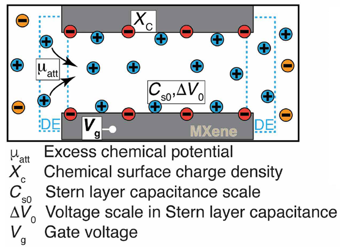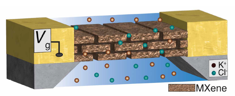 Figure 3. Schematic model of ion transport in a MXene transistor channel controlled by Donnan Equilibrium (DE) and gate voltage (Vg) (Pendse et al., 2025).