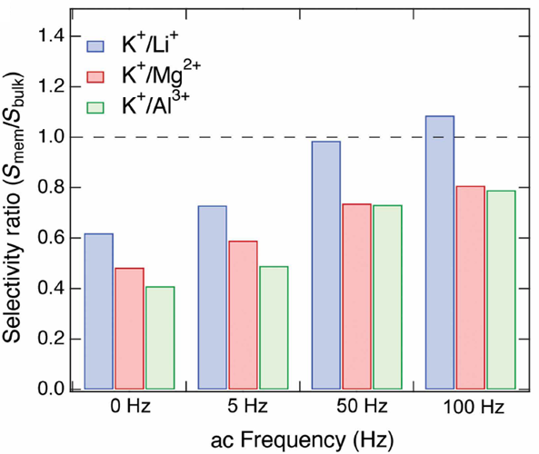Figure 5. Selectivity ratios for different ion mixtures as a function of the applied gate voltage frequency (Pendse et al., 2025).