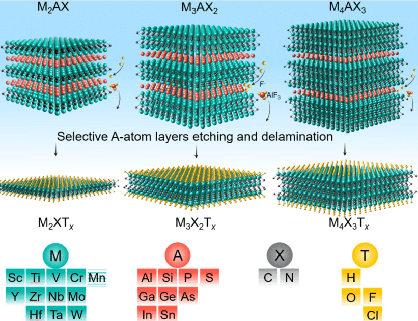 Figure 1. Synthesis process of 2D MXene nanosheets with functional surface groups from a layered MAX phase precursor via the selective etching method (Hong et al., 2020).